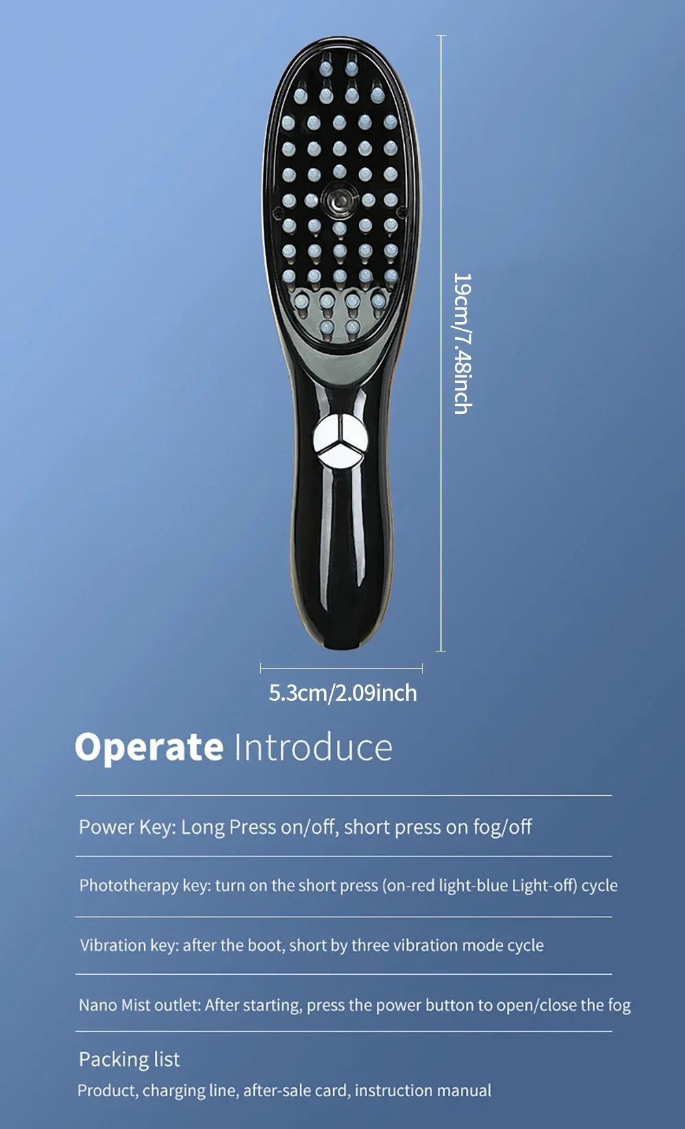 2.Vibration massage function: three gears can adjust the intensity, improve the metabolism of hair follicles, promote blood circulation in the brain, help hair growth, and prevent hair loss.